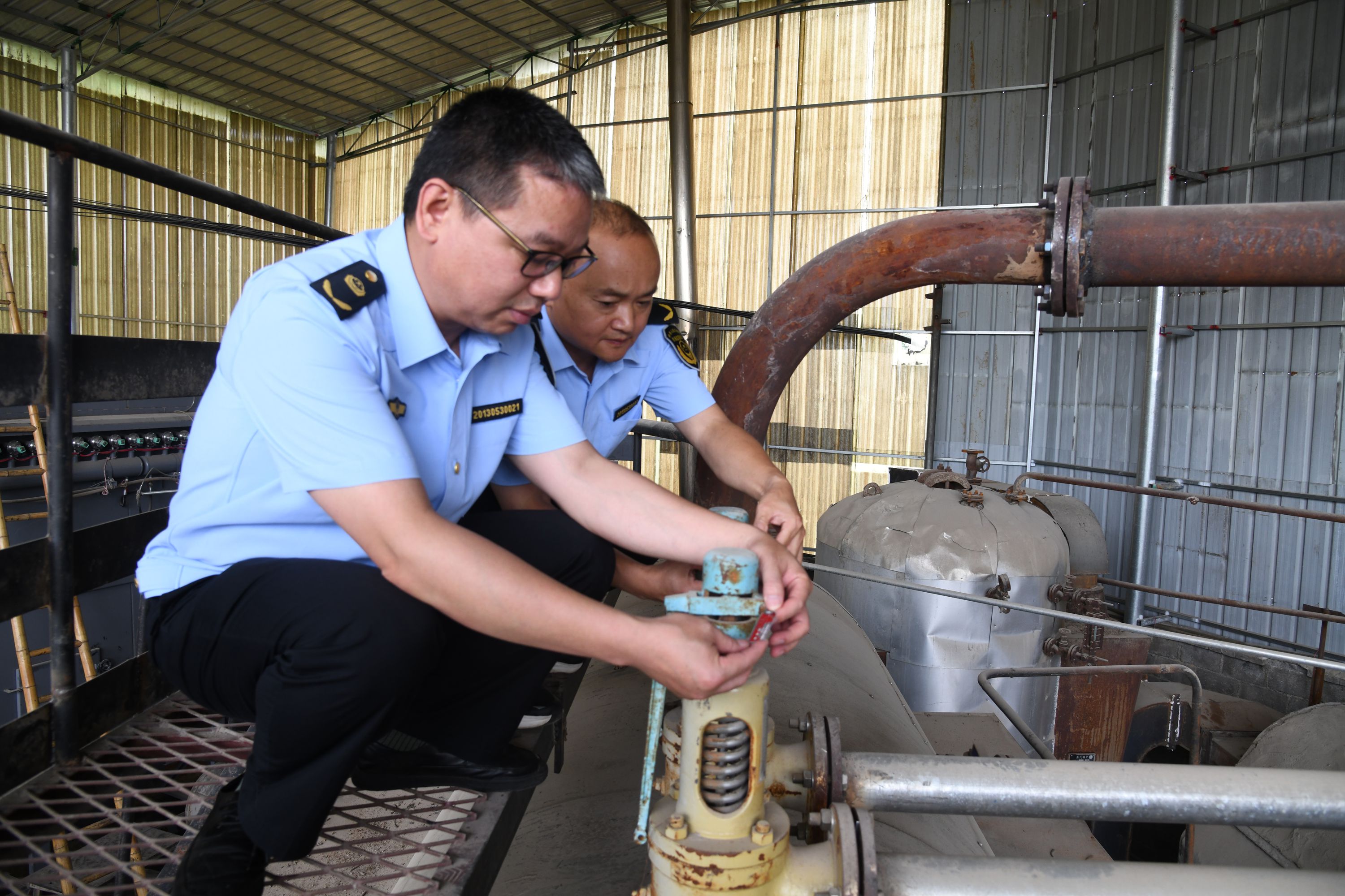實(shí)操演練的執(zhí)法人員正在現(xiàn)場(chǎng)對(duì)鍋爐安全監(jiān)察情況